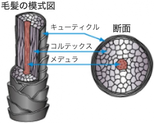 髪の毛は裂けるチーズのように筋状のタンパク質がキューティクルと呼ばれるウロコ状のものに包まれています。