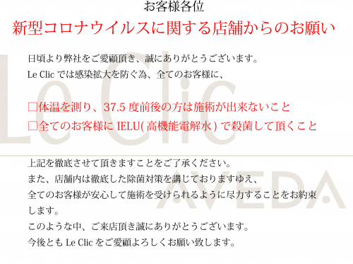 ルクリックはお客様が来店し、安心して施術を受けられるよう徹底した除菌対策を講じております